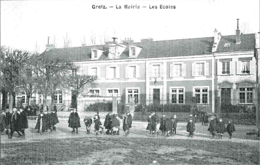 C'est sous l'impulsion d'une expropriation publique de 1857 que la Municipalité de l'époque décidé l'installation de l'école à proximité de la mairie. A l'issue des différents aménagements nécessaires pour l'accueil des écoliers, on scella dans la façade une plaque en fonte avec l'inscription suivante : "L'école communale de Gretz a été bâtie en l'an 1859 sous l'administration de M. Louvet et la direction de MM. Lussy et Chelli, architectes, à l'aide des ressources extraordinaires créées par le Conseil municipal et les plus imposés au rôle de la contribution foncière et aussi avec la noble et généreuse coopération de M. Topin, desservant de cette paroisse.
