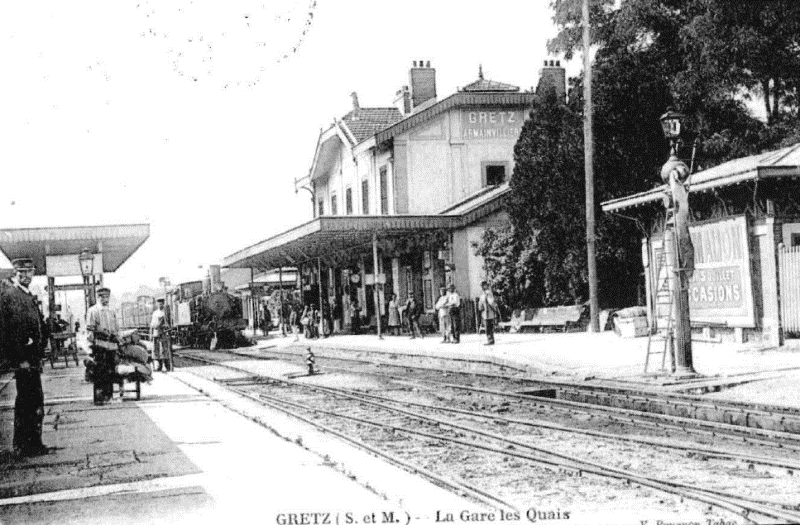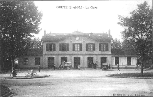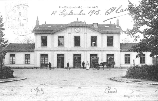 La Compagnie des chemins de fer de l’Est commence les travaux d’aménagement et de construction de la gare en 1855 et met la station de Gretz en service le 9 février 1857. La gare de Gretz constitue, à cette époque, une étape de la section de Nogent à Nangis. Plusieurs administrateurs de la Compagnie font aussi partie de la communauté gretzoise. En effet, certains d’entre eux, tels les Pereire ou les Rothschild, jouissent de domaines sur la commune. Les frères Pereire s’installent à Gretz en 1852 et le baron Rothschild transforme un ancien domaine familial en résidence luxueuse en 1877.