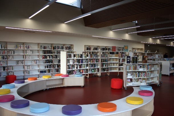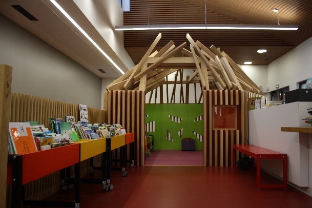 Autrement attirante et d’un autre style architectural, l’extension, qui abrite la salle de lecture et une salle réservée à l’accueil des groupes, constitue un élément brut et minimaliste qui semble se marier à merveille avec la pierre de taille et la brique du XIX° siècle. Savoureux mélange de bois, de verre et de béton, cet espace est un prolongement de la médiathèque et offre au public un vaste espace de lecture et de consultation. Ouvert côté cour par une longue baie vitrée camouflée par des panneaux de bois, la salle de lecture dispose d’une lumière naturelle très agréable. Si le visiteur a la possibilité de rentrer à l’intérieur, il découvrira avec plaisir l’atmosphère reposante et les matériaux bruts et doux propices à la détente et à la lecture. Un élément architectural original habille le centre de cet espace : une cabane. Espace réservé aux enfants, cette petite cabane aux couleurs chatoyantes constitue une partie de l’identité forte de la médiathèque de Gretz-Armainvilliers. En osant aller jusqu’au fond de la salle de lecture, le visiteur trouvera un vaste espace habillé de fauteuil et d’un arc permettant au public se profiter de la vue panoramique sur le jardin et le parc situé à l’arrière de l’ancienne demeure familiale.