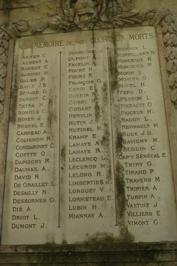 On retrouvera les listes des morts pour la France sur les différentes faces du monument. D’abord les 74 noms des soldats morts pour la France lors de la Première Guerre Mondiale ; puis, les soldats morts durant la Seconde Guerre Mondiale ; et les engagés morts pendant la campagne en Algérie.