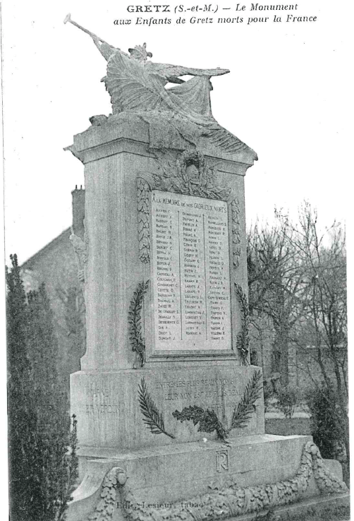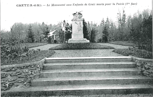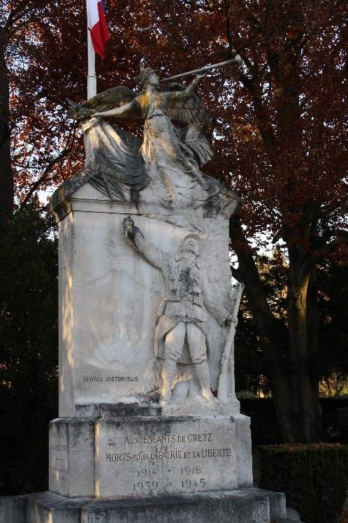 Le monument aux morts de Gretz a été élevé sur un terrain offert par la Compagnie des Chemins de Fer de l’Est. Il est surmonté de la Victoire qui sonne le triomphe du Droit et de la Justice. La face représente un Poilu qui blessé mortellement brise la chaîne que l’ennemi forgeait contre la France. A l’arrière sont gravés les noms des 74 héros tombés au champ d’honneur.