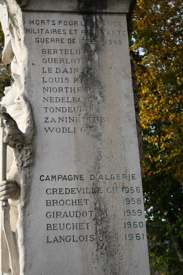 Monument central des commémorations et lieu de mémoire de notre Histoire, érigé à l’initiative du maire Arthur Papon, le monument aux morts est un souvenir des 3 grands conflits qui ont marqué l’histoire du XX° siècle en France et dans le monde : la Campagne d’Algérie (1954-1962) et notamment les deux guerres mondiales (1914-1918 et 1939-1945). Œuvre réalisée par Alphonse et Carmelino Cagna dans leur atelier rue Louis Pasteur à Boulogne sur Seine.